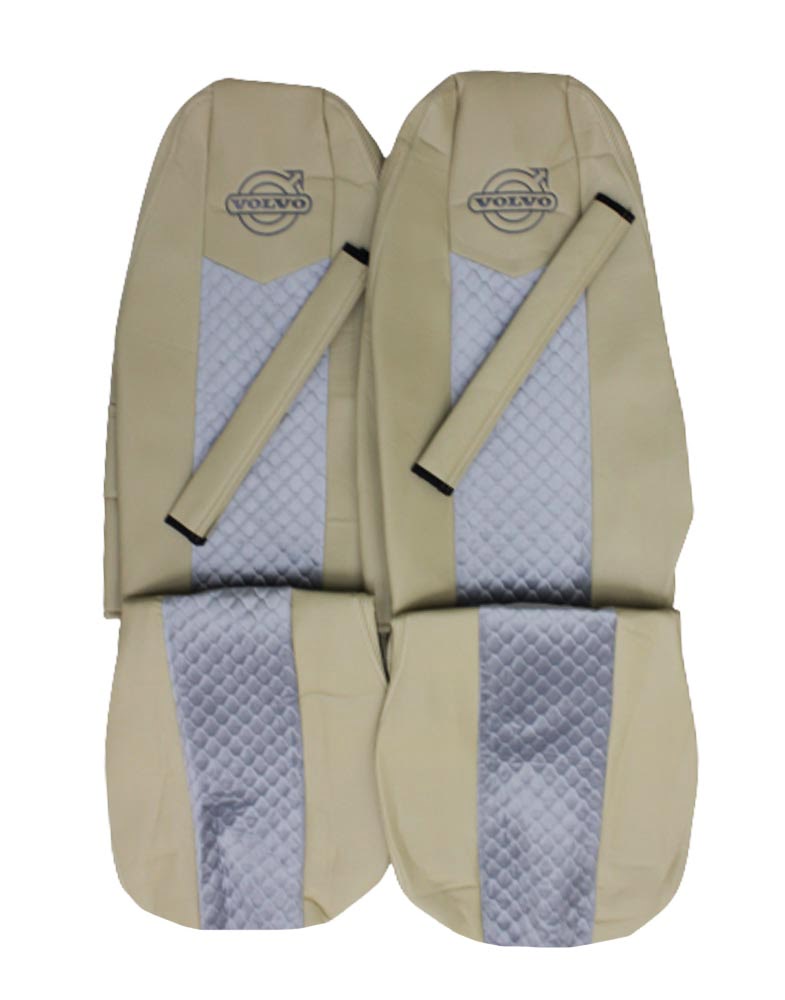 Чехлы на грузовой автомобиль VOLVO FH, FM. Изготовлены из экокожи по бокам и стеганого велюра по центру. На подголовниках вышит логотип авто.