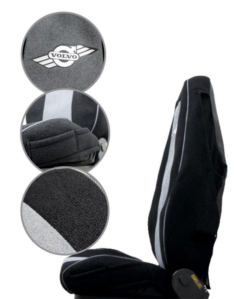 Чехлы VOLVO "Rest" для грузовых автомобилей VOLVO изготовлены из комбинации экокожи и бархатной ткани. У данной модели предусмотренны вырезы под подлокотники. Ткань и кожа триплируются на поролон высокой плотности толщиной 5мм на собственном оборудовании, что придает чехлу мягкость и высокую сохранность от быстрого истирания. Крой чехла точно повторяет контуры кресла: спинка имеет отверстия для ремней безопасности, боковой замок для быстрой и легкой установки чехла на кресло.