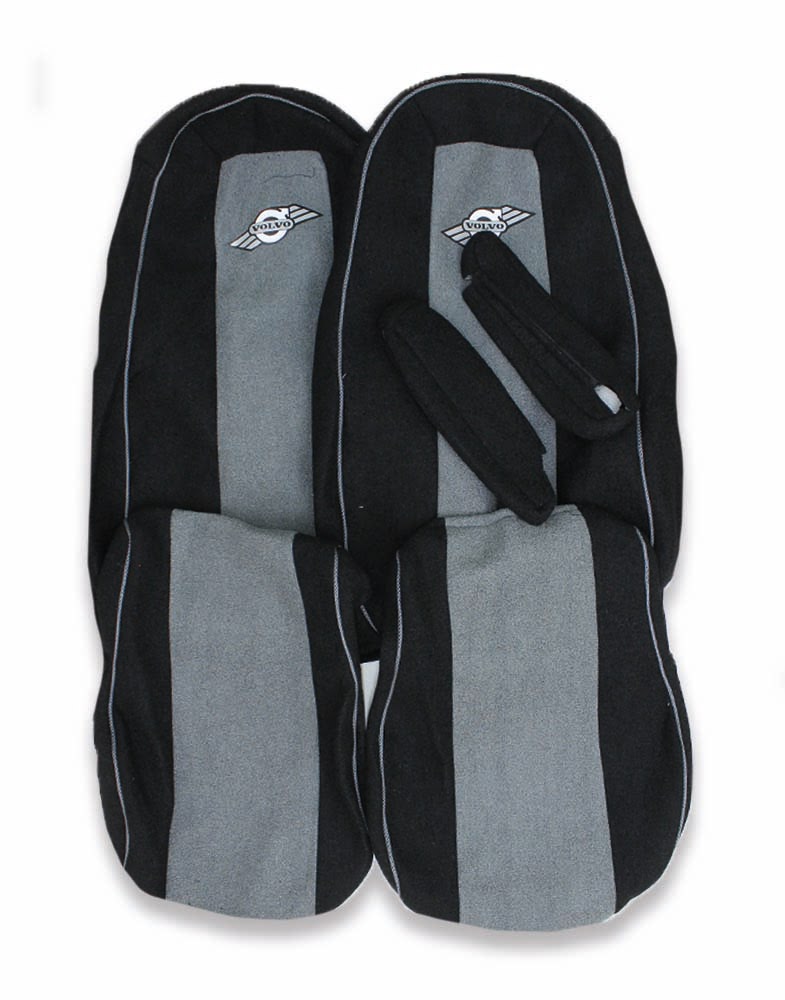 Комплект чехлов на VOLVO FH16. Изготавливаются из комбинации мебельной ткани «Астра» двух цветов. Задняя часть изделия выполнена из экокожи. На подголовники нанесен логотип авто.