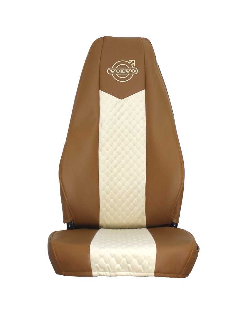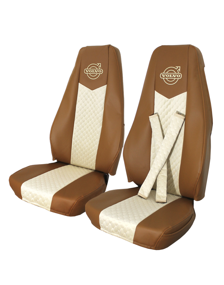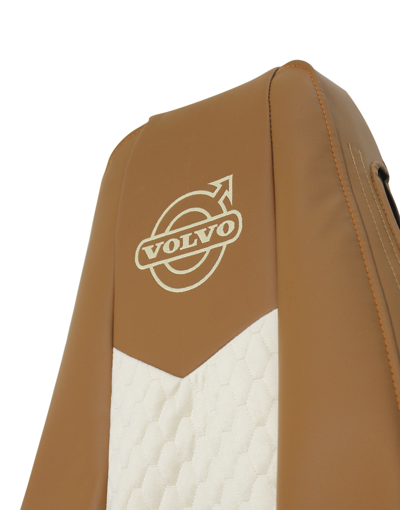 Чехлы на грузовой автомобиль VOLVO FH, FM. Изготовлены из экокожи по бокам и стеганого велюра по центру. На подголовниках вышит логотип авто.