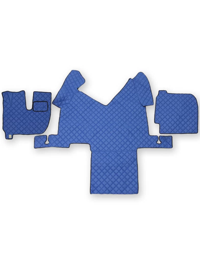 Стеганый коврик на IVECO Stralis АКПП синий. Изготовлен из трех слоёв ткани: экокожа, поролон 8мм, спанбонд высокой плотности. Для придания прочности края изделия окантовывается 20 мм. стропой. Коврик изготовлен по оригинальным лекалам на собственном производстве с использованием материалов высокого качества.