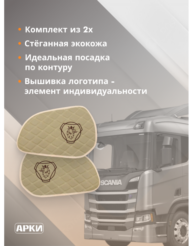 Комплект дверных вставок с вышивкой на грузовой автомобиль SCANIA 5. Изготавливаются из стеганой экокожи в темно бежевом цвете. Завершают единый образ кабины, украсят ваш грузовик и придадут ему индивидуальности.