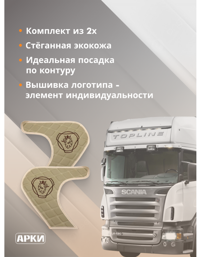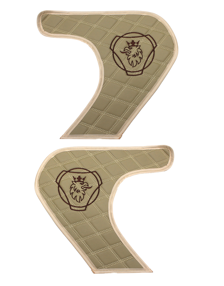 Комплект дверных вставок с вышивкой на грузовой автомобиль SCANIA 6. Изготавливаются из стеганой экокожи в темно бежевом цвете. Завершают единый образ кабины, украсят ваш грузовик и придадут ему индивидуальности.