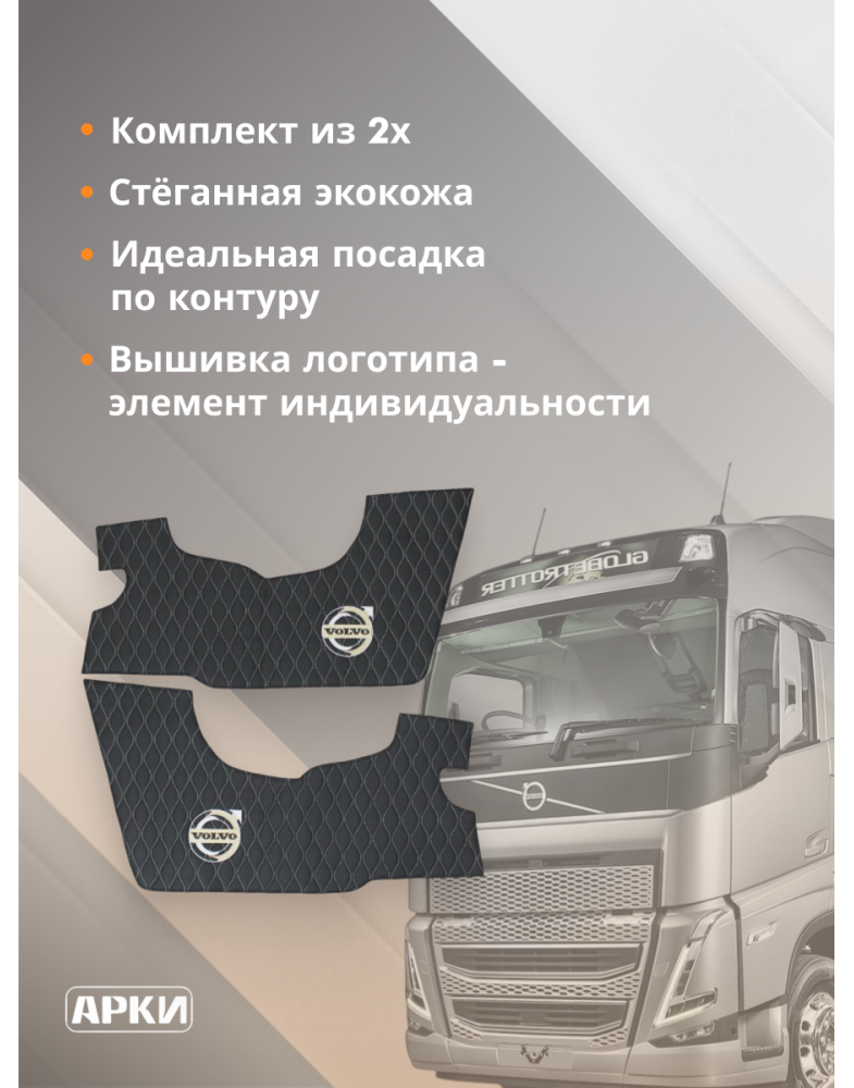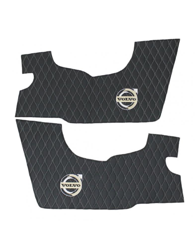 Комплект дверных вставок с вышивкой на грузовой автомобиль VOLVO FH16. Изготавливаются из стеганой экокожи в черном цвете. Завершают единый образ кабины, украсят ваш грузовик и придадут ему индивидуальности.