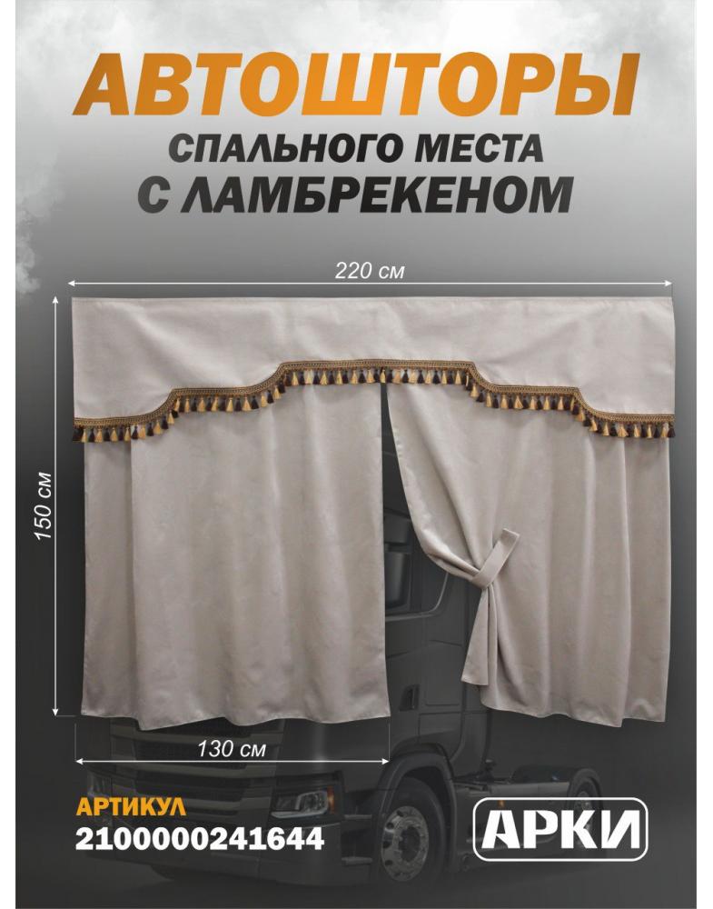 Красивый комплект штор в спальный отсек грузовика с ламбрекеном. Комплект изготовлен из ткани кабрио бежевого цвета с атласным подкладом. Кабрио имеет приятную текстуру, с плотной поверхностью, которая держит форму. Ткань стойкая к истиранию, не линяет и не скатывается. В комплекте 2 подхвата в виде ремешка с застежкой-фастекс для фиксации штор. Ламбрекен обрамлен бахромой. Комплект добавит в ваш салон эстетики и уюта, сделает ваш отдых комфортным и спокойным.